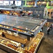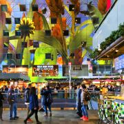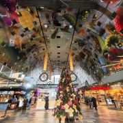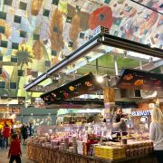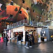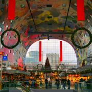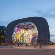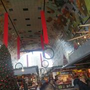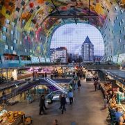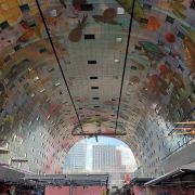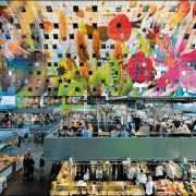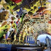 市场大厅是一座U型的拱廊市场,现已成为荷兰新地标。由荷兰建筑工作室 MVRDV 亲手打造而成,壁面的超大绘画是由艺术家 Arno Coenen 和 Iris Roskam 携手完成,灵感来自于市场上的产品,内容囊括了荷兰的传统食物、花卉和昆虫等。富丽堂皇的屋顶内部贴有超过4000种不同颜色的瓷砖,仿若现代版的西斯廷教堂。现在这里有大量摊贩进驻,商品琳琅满目、应有尽有,包括时令蔬果、面包甜点、鲜花、海产品,充分彰显出一种市集艺术。