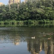 再进去就是公园主体,一块湿地,面积不小,周围是环湖步道,里边有野鸭子,有各种各样的鱼,数量还真不少,还栽了荷花和睡莲,这次去荷花正在打苞,下周估计就能开不少了。湿地中央有一个观湖台,好多人在这里赏景喂鱼,风景确实也不错。