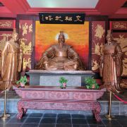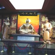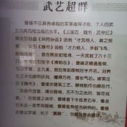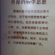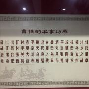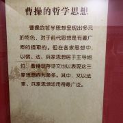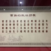 魏武祠内介绍了曹操的家族,生世,人生足迹,生平政治军事功绩,以及诗歌文学造诣。曹操祖父曹腾是个宦官,阉人无后,但当时宦官可娶妾养子,曹嵩是曹腾的养子,曹嵩生曹操。但曹嵩的生世竟无从考证。