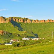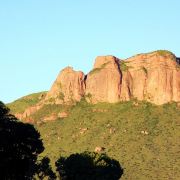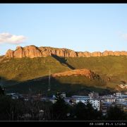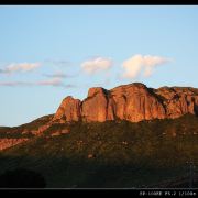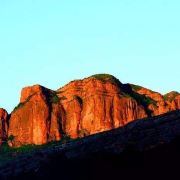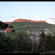 舒缓的山体顶部突拔起高耸的红岩赤壁,夕阳残照里显示出赤红的色彩。观看红石崖的位置是与之对应的山坡,人们叫这里为花盖神山,也就是格尔底寺庙之后的山坡。