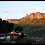 在这里北望可以远眺郎木寺全景,而且是处在阳光的西照中;东向则是收尽朗木镇村落的红石崖山顶;向东南看去是一片浓密的森林烘托着灰色岩石的山峰,那就是纳摩峡谷。