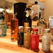 “俺们月桂冠四百年前是这种木桶,三百年前是这种包装,诶,厉害了,这款是我们火起来的铁道款包装,你看这个蓝色的漂亮玻璃瓶,它自己带一个小杯子,可以立在桌子上,任凭火车摇摇晃晃。”