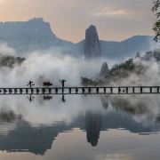 镜头中,岸上的鼎湖峰挺立擎天,横亘的板堰桥隽秀宁静,清澈的练金溪薄雾迷朦,水中的鼎湖峰婀娜多姿~仙气十足。