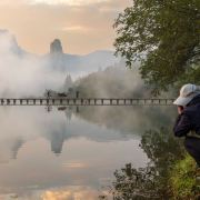 可一进景区,漫步仙堤,所有游客的目光都投向了南侧、所有长枪短炮都对向了南方:哇!一条清溪、一座长桥、一柱独峰、一抹薄雾~正是仙都景区闻名世界的成名照。