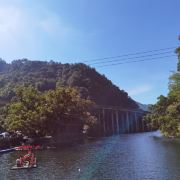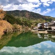 我漫步在桥上放眼望去,色彩斑斓的树木和蓝天白云倒映在水中,秋色撩人,木笺上站着一个红色少女,没有看到多少游客和村民。感觉那么的宁静致远,仿佛时间停留不动。