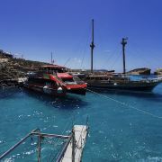 马耳他蓝湖是一处受到保护的小海湾,有着铺着白沙的海床和如晶莹剔透的海水。根据阳光水深和矿物质等自然条件的不同,海水由远及近呈现出不同的层次。停泊在水面的游船投影可以印在海底,就像船在玻璃上停泊一样。