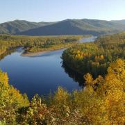 白鹿岛位于莫尔道嘎国家森林公园内,距离山门100公里左右。激流河注入额尔古纳河入河口上游处,有两个修长小岛相偎而卧,河水呈“S”形回环于两个小岛之间,且岛上野花丛生,红豆遍地,松黛桦橙,山光水色,美不胜收,这便是白鹿岛和苍狼岛。白鹿岛风光夏秋两季有不同风貌,夏天基本呈现绿色,而秋天却有着不同的颜色层次,是摄影的大好时机。