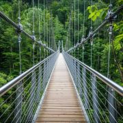 扎兰屯的吊桥,由悬索桥与桁桥组成。吊桥也就是悬索桥,由两根巨大的铁索悬空而成,上面系有约42根细铁索,下面由木板铺就,行人往来桥上,如轻舟泊于水面悠悠晃晃,大有飘若欲仙,心旷神怡的感觉。紧与吊桥相连的,是一由12根左右的钢筋吊起的拱桥“桁桥“,人在桥上一晃,桥身不停颤动,可持续十多分钟。悬索桥与桁桥形体不同,风格各异,就像姊妹桥,两座桥相连,统称为”吊桥“。