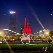 1⃣️路过人民公园的时候,看到了一个红色的雕塑十分引人注目,就像青岛的五月的风济南的泉城广场一样,晚上在灯光下更加的雄伟壮观,在雕塑前面还有一个临沂市0公里标志的小建筑像卢浮宫门口的玻璃街拍一版,但是是个袖珍版的。