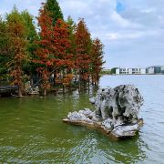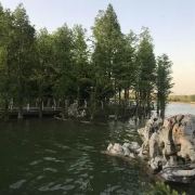 进入牧城公园的入口不远处,便是开阔大气的明湖广场,该广场总面积10000多平方米,建有下沉式广场,设置了多彩绚丽、动感十足的音乐喷泉。临近江堤,建有一个总面积7000多平方米的临江广场,广场上的木质廊架、巨型太湖石、亲水平台构成了一道绝美风景。除了这两个大型广场外,公园内还有多个小型广场,可供游人休憩和观光车辆停放。走过明湖广场即是明湖,明湖约占牧城公园五分之一面积,约600亩。明湖被九孔桥一分为二,北侧湖面形如太阳,南侧湖面形如月牙,神似大写的“明”字,切合“明湖”之意。行走在明湖岸边,可见湖面广阔,湖中小岛接长堤,长堤连木桥。通过荷花桥连接在一起的荷花池、荷花亭被完全融入了景观水系,很有观赏性,风景秀丽宜人。来到明湖岸边,可见两块带状沙滩、鹅卵石滩。人造沙滩约700米长,鹅卵石沙滩约300米长,沙子、鹅卵石全部是从外地运来的。在这里,可享受赤脚踏沙的乐趣,放松身心。公园里有多处自然形成的湿地,芦苇、荷花、水葱、睡莲、再力花等30多种水生植物生长在湿地景观区里。园内共70多亩的湿地在提供水资源、调节气候、涵养水源、降解污染物、保护生物多样性等方面发挥重要作用。穿行于园内小道,一块块各具特色的太湖石令人惊艳,这些奇石千姿百态,凸显大自然的鬼斧神工。在牧城公园里,七块奇石分布在园内各处,其中较大的一块被放置于临江广场,面朝长江,如同一匹骏马腾飞于大江之上。