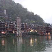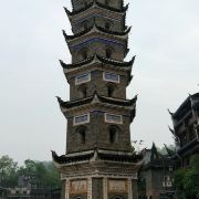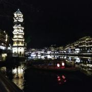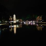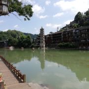 万名塔七级六角砖塔,每层六个翘角,精美秀丽,且悬挂铜制风铃。塔的六面都密密麻麻刻满了捐资者的名字,可惜没有楼梯直通塔顶,只能外观。个人觉得这一片是凤凰古城最出彩的地方,穿过虹桥后看到的如同一幅江南水乡的画卷:万寿宫、万名塔、夺翠楼……一种远离尘世的感觉悠然而生。夜晚的塔内有温暖的黄色灯光,很适合拍照,倒影映入沱江碧波之中,摇摇晃晃,更是美丽。万名塔往下走是沱江泛舟的下游,比门票包含的沱江泛舟要好多了,坐上乌蓬船,听着艄公的号子,看着两岸的吊脚楼,别有一番韵味。