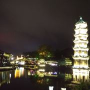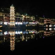 万名塔这片游人相对少些,景致很美,塔下很多出租苗族服饰用于拍照,个人觉得在这拍照要清静多了,出租价格都一样。万名塔最美的是夜景,晚上整个塔身都要亮灯,在凤凰逗留的一定要来看看这边的夜景,两岸的酒吧比起北门城楼下的也要清静多了。夜色中的万名塔和虹桥通体金黄,金碧辉煌如天上宫阙。万名塔屹立沱江北岸,塔影倒映江心,水中岸上两个塔,蔚为壮观。