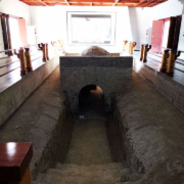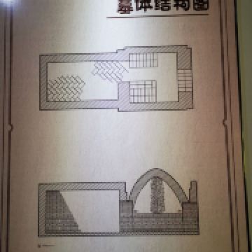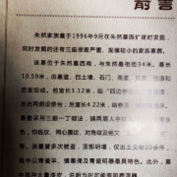墓园内有文物陈列馆。陈列馆为一座汉代风格的仿古建筑。馆以墓体为基础,古朴凝重。馆内大厅中间部分是墓穴,穴中置有棺木。四周陈列有墓中出土的文物和有关朱然墓研究的图片、中外文献资料等。游客在参观中,可以领略到1700多年前三国时代的社会风貌。墓道位于墓坑正南,为阶梯式,共26级,坡度19度。墓道长9.10米,土色与封土相同。墓坑在封土下,上口距地面深35厘米,墓坑形状不甚规则。坑底稍小于坑口,距墓上口深3.60米。墓壁不甚光滑,墓坑内填有灰白色土。