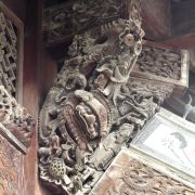 村中有三座祠堂,总祠江氏宗祠、溥公祠、明代孝子江文昌的孝子祠,其中江氏宗祠是村中尤为值得一看的建筑。江氏宗祠始建于明永乐年间,宗祠上的徽派三雕砖雕、木雕、石雕非常精美,注意宗祠屋顶上,有一个宝葫芦上插着三叉戟,这是金鳌江氏建筑的特色。