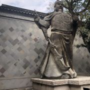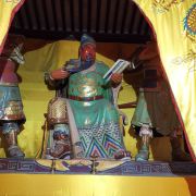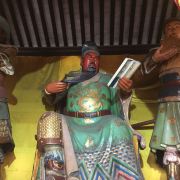 关帝庙内供奉着关武大帝的青铜像,威风凛凛,在关公两侧供奉着是关公的大将周仓,关平。周仓是关帝爷的侍卫,日常为他持护青龙偃月刀,上马为将,下马为侍,忠心耿耿;关平是关羽在征战途中收的义子,随着关帝爷南征北战,战功显赫。