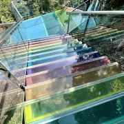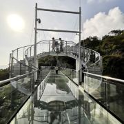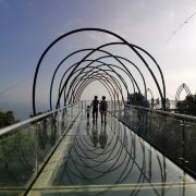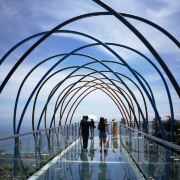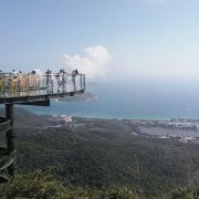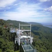 海南全海景玻璃栈桥位于三亚亚龙湾热带天堂森林公园之巅,海拔450米。栈桥全长400米,宽处10米,由130吨超白进口夹胶玻璃构成。路面使用3米×3米的超大透明玻璃铺设,游客可俯瞰逾百米深的雨林山谷,远眺“天下第一海景”亚龙湾。栈桥还包含凌空台、七彩天梯等景点,是集刺激与美景于一体的网红打卡地。