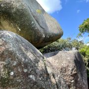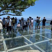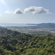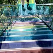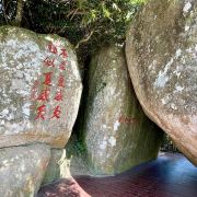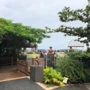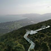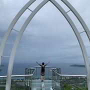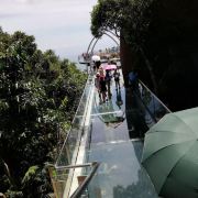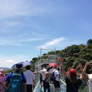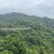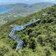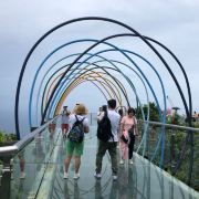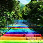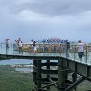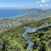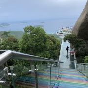 进了森林后,我们乘坐电瓶车到山顶。还需走约6层楼高的台阶,穿过2块大石头后,首先映入眼帘的是七彩云阶,走在彩虹一般的阶梯上🌈 可以远眺一下可以360度全景俯瞰亚龙湾的海滩和热带雨林的凌空台。