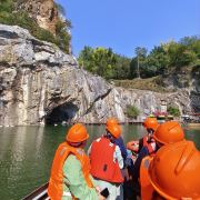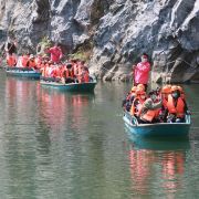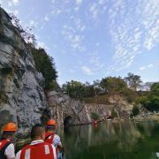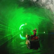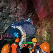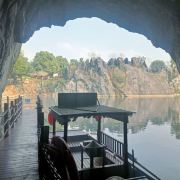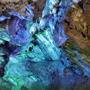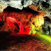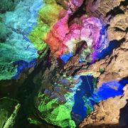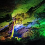 石花水洞并不是很大,却集众多溶洞的特点于一身,洞内有石笋、石柱、石瀑等景观,在景观灯的照耀下显得绚丽斑斓,尤其是洞内发育生长的“一石二花”——卷曲石、文石花和方解石晶体花,这都是非常珍贵的溶洞景观。乘船游于曲折蜿蜒的地下暗河之上,宛若遨游龙宫,让人浮想联翩。