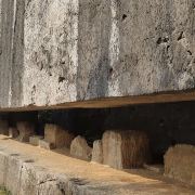 碑额高10米,长20米,在巨石的半腰处凿出三个方形石洞,推测是为日后截断做的准备工作。碑额之后,硕大的碑身横卧于地,先不论将它立起来有多高,光是横卧在那,就已有三层楼那么高。碑座离碑额大约200米,乍看之下犹如一座小山。