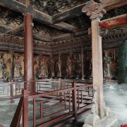 寺庙依山而建,坐西朝东,保持了辽代契丹族尊日东向、崇拜太阳的习俗。寺院建筑雄伟古朴,布局严谨规整,除常规建筑外,还有清代皇帝的行宫,有雍正皇帝赐名的“四宜堂”(南玉兰院)和乾隆皇帝题名的“憩云轩”两座庭院建筑,可见其地位之高。大雄宝殿南北两侧塑的二十诸天立像,性格鲜明,生动传神,虽历经五百余年的风蚀剥落,但其高超的技法、细腻的画工,依然可以使人感受到佛家的庄严与皇家的气派。
