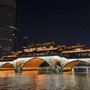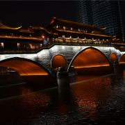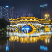 安顺廊桥有着悠久的历史,最初的建筑踪迹可以追溯到元代。在马可•波罗的游记中,安顺廊桥是他印象中较为深刻的四座大桥之一。现在看到的是在2003年设计修建的了,得以恢复其大致的原貌。由于安顺廊桥的夜景非常美丽,也曾经出现在成都的城市旅游宣传片中,频繁地出现在大众的视野中,名气和熟悉度也远远高于九眼桥,也让很多人因此去安顺廊桥打卡拍照,欣赏这令人沉醉的夜景风光。一到夜晚,桥上的霓虹灯光亮起,整座桥就成为河上最耀眼的风景。明代风格的廊桥在暖黄色灯光的映照下显得别有韵味,彰显出了成都这座历史文化名城的浓郁内涵。半圆形的桥洞与水中的倒影相互映衬,组合形成了一个完整的椭圆,好似模糊了虚与实的界限。