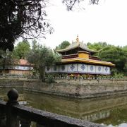罗布林卡其中的宫殿也均是当年精心修建的,建筑以金色房顶,红白围墙的藏式风格为主,布局大多依水而建。园林中间是一座小湖,走进水中间的湖心亭放眼观去,古木参天、芳草遍地,周围凉亭、水榭、回廊布局相得益彰,精致的让人觉得仿佛来到了苏州园林之间,十分优美。