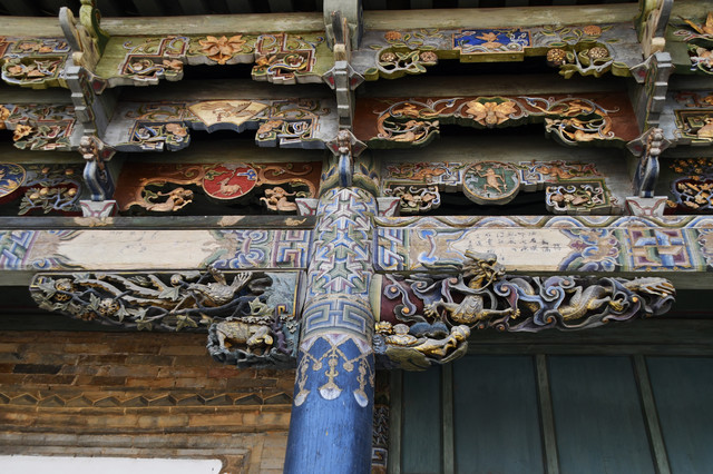郑氏宗祠在陈氏宗祠东面约百多米远的地方,建于清光绪八年至十三年(1882~1887年),坐北朝南,占地面积1452.6平方米,由祠门、中殿、正殿、偏殿组成二进四合院。由于建造时间较早,大约又从来没有大修过,衰败之象已经很明显了,但仔细一看,也是雕梁画栋、描金绘彩的。特别是大门檐枋、正殿屋檐,雕刻之繁复、细腻、精美,又超过了陈氏宗祠。
