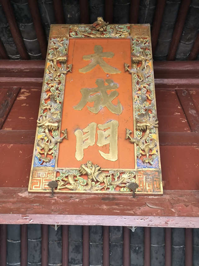“洙泗渊源”坊,现存建筑为清乾隆四十三年(1778年)重修。(背面是“万世宗师”匾额),为典型的五开间三门道古牌楼建筑,通面阔23.7米,进深7.7米,高9米,占地180平方米。