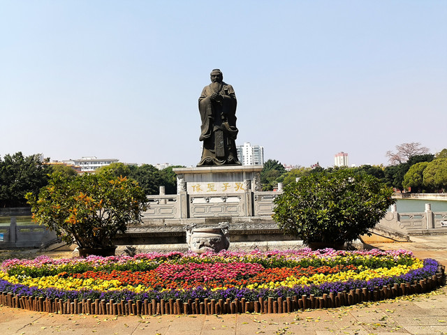 进入礼门、义路坊、洙泗渊源前半月形的月台广场为文庙第三进庭院空间。这里远山近水,焕山倒影,风光如画,尽收眼底,令人心旷神怡,无不令人感叹中国传统园林的奇巧状美。