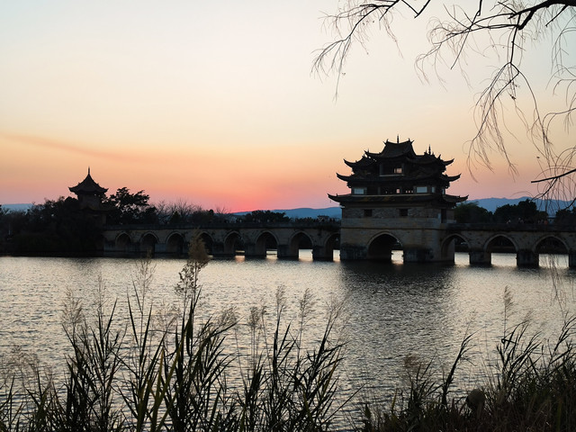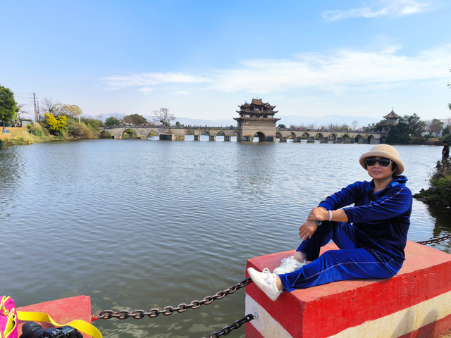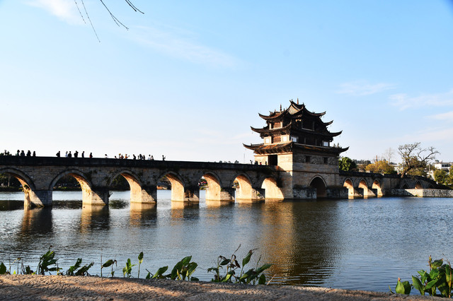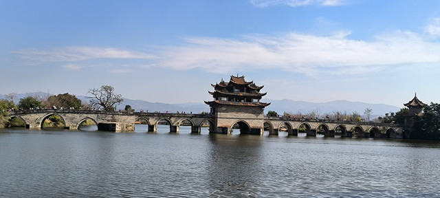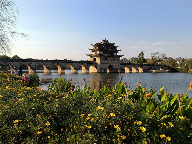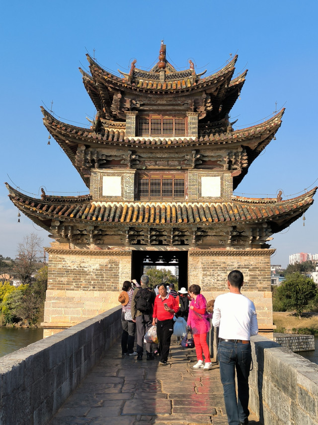 双龙桥位于建水城西3公里的泸江与塌冲河上,清乾隆年间先建三孔,道光年间有建十四孔与之相连,因此俗称“十七孔桥”,因两河蜿蜒如龙,故而得名“双龙桥”,双龙桥是一座三阁十七孔大石拱桥,长148米,宽3-8米,是云南省著名古迹之一,被认为是云南省规模最大、艺术价值最高的一座多孔连拱桥,已列入中国造桥史册。 桥中建有三座飞檐式阁楼,楼中有楼,桥楼相映,蔚为大观,不失为我国造桥史上极为珍贵的杰作。两端阁楼略小,居中一座大而壮观,素有“滇南大观楼”之称。建水小火车第二个停靠站点就是这个双龙桥站,我们往返团山民居都经过这里,有足够的时间从不同时间段、不同的角度去欣赏这座了不起的桥。(免门票)