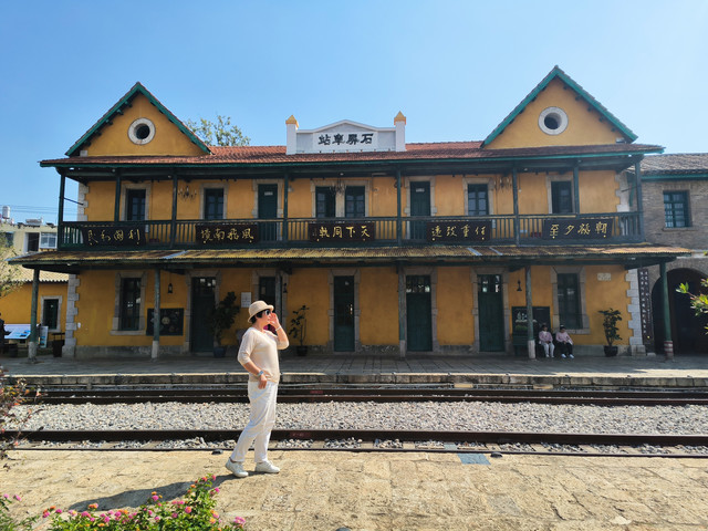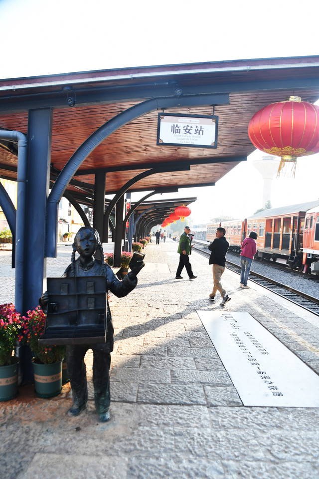 临安站作为建水古城小火车的始发站,占地面积15000平方米,其中包括临安站售票大厅、火车头主题雕塑、浮雕墙、铁路文化走廊、铁皮剪影区、老火车展厅、主题广场、个碧临屏铁路建水展厅、寸轨机车检修槽、英国产蒸汽机车等数十个游览点。临安站:这里是建水古城小火车的始发站,鹅黄色旧墙,满满的法式风情。