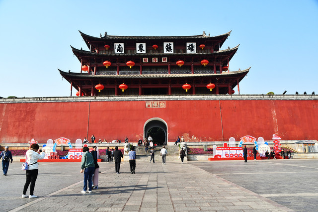 朝阳楼位于建水古城临安路,处于古城中心地带。原为明代临安卫东部军事防御工事,城门为“迎晖门”,上面建 有“朝阳楼”。始建于明洪武二十二年(1389年),后经明天顺七年(1463年)、清乾隆二年(1737年)、嘉庆四年(1799年)、道光三十年(1850年)、公元1955年3月、2011年5月七次重 修,得以完整保存。朝阳楼坐西朝东,通高24.45米,分布面积2448平方米,建筑占地面积414平方米。城楼雄距在8米多高的城垣之上,由48根巨柱支撑,为三重檐歇山顶抬梁式大木构架、五 开间三进间回廊式建筑。朝阳楼被称为西南地区的小天安门,至今由600多年历史了,比北京天安门还早建28年。所以,来到建水一定要登上朝阳楼好好看看美丽的大西南!