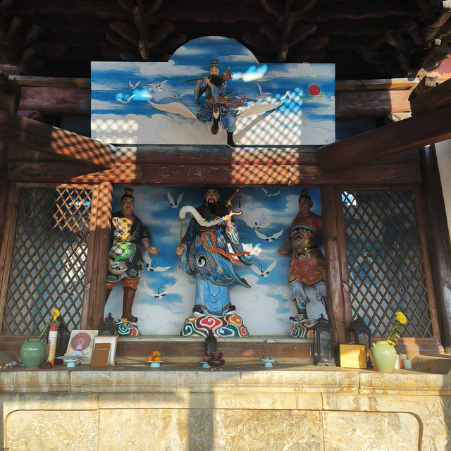 “德配天地、道冠古今”坊:两坊建制相同,为三开间四柱五楼单门道砖木结构牌坊,通面阔16米,进深5米,高9米,现存建筑为清乾隆五十七年重建。