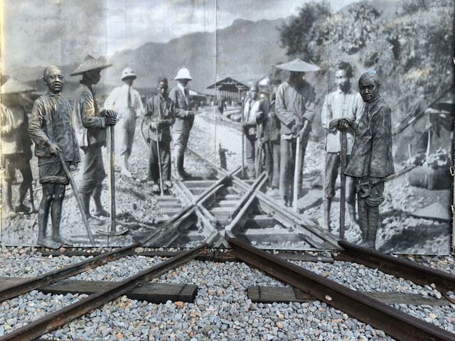 浮雕墙:这幅浮雕作品拍摄于1921年的蒙自碧色寨寸轨铁路与米轨铁路的平交道口交汇处。这块浮雕的工艺表现形式在四川宽窄巷子比较常见,但是在云南还是第一块。整个浮雕分为两个部分,同铝合金浮雕部分突出人物和部分场景的立体造型感,铝板影雕制作的平面老照片影像成为整个作品的背景画面。这面浮雕墙整体还原了这幅作品。
