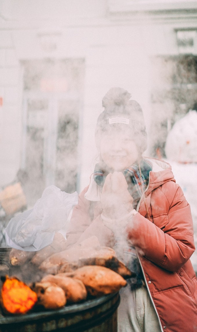 远远看见了卖红薯的大爷推车走来,热气腾腾的烤山芋,烟雾弥漫。