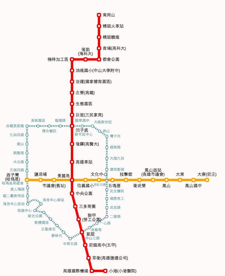 一般常说的高雄市中心,大概就是高雄火车站往南一带,因为知名景点较多。大约5-6站的距离,车程约10-15分。
