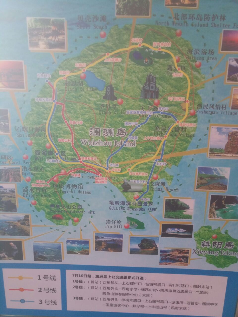 骑单车估计一天游玩不了,七八月涠洲岛的天气不是一般的热,没有好的体力是不行的,建议租电动车,一天50-60元。建议住滴水丹屏附近的酒店,那里有成熟的夜市,可以吃东西,傍晚还可以下海游泳和看日落。只是相对于岛东那边这边的房价比较贵。滴水丹屏、石螺囗和鳄鱼山公园是在岛西,可以一起玩。只是鳄鱼山公园耗时比较长,且不能开车到公园门口,要把车停在交叉路口处保管步行近两公里的路才能到景区入口。。所以时间要合理安排。游玩这三处返回岛西游客中心,从附口路口下南奥街游玩。那里有海鲜市场和酒吧,可以买点海鲜回酒店加工。游完南奥街可以从街尾去五彩滩,其中有一段上坡路很陡,电车不给力,可能得推车。😂😂😂游玩五彩滩就可以从环岛路去教堂,游玩教堂继续沿环岛路去相思湖水库。这样岛上景点也差不多游完了。。。