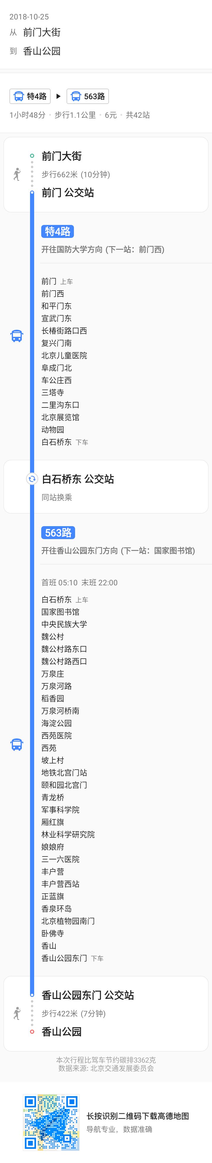6、从前门到香山公园东门大概路程26.38公里,全程约需83分钟,途经33个站点,共换乘2次,换乘车辆线路有673路→地铁4号线大兴线→331路。