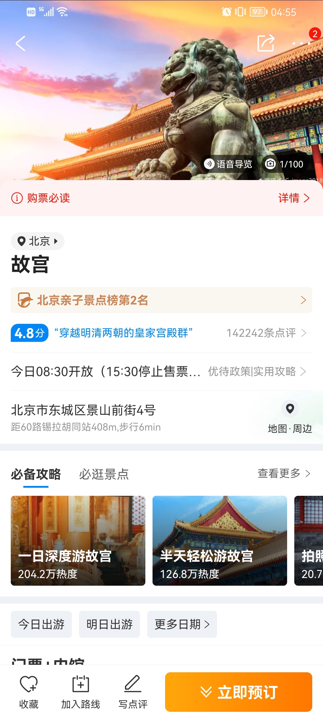 故宫门票需要提前一天网上预约,当天是不售票的,找“秀才说”专业讲解团队带您游历北京各大文化景区