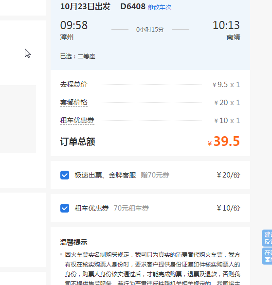 你好,当你选好车票点击预定——买票后,在订单填写页面下方的‘套餐说明 优惠券套餐’中,选择‘不够买套餐’,然后再支付,就不用多花钱了。