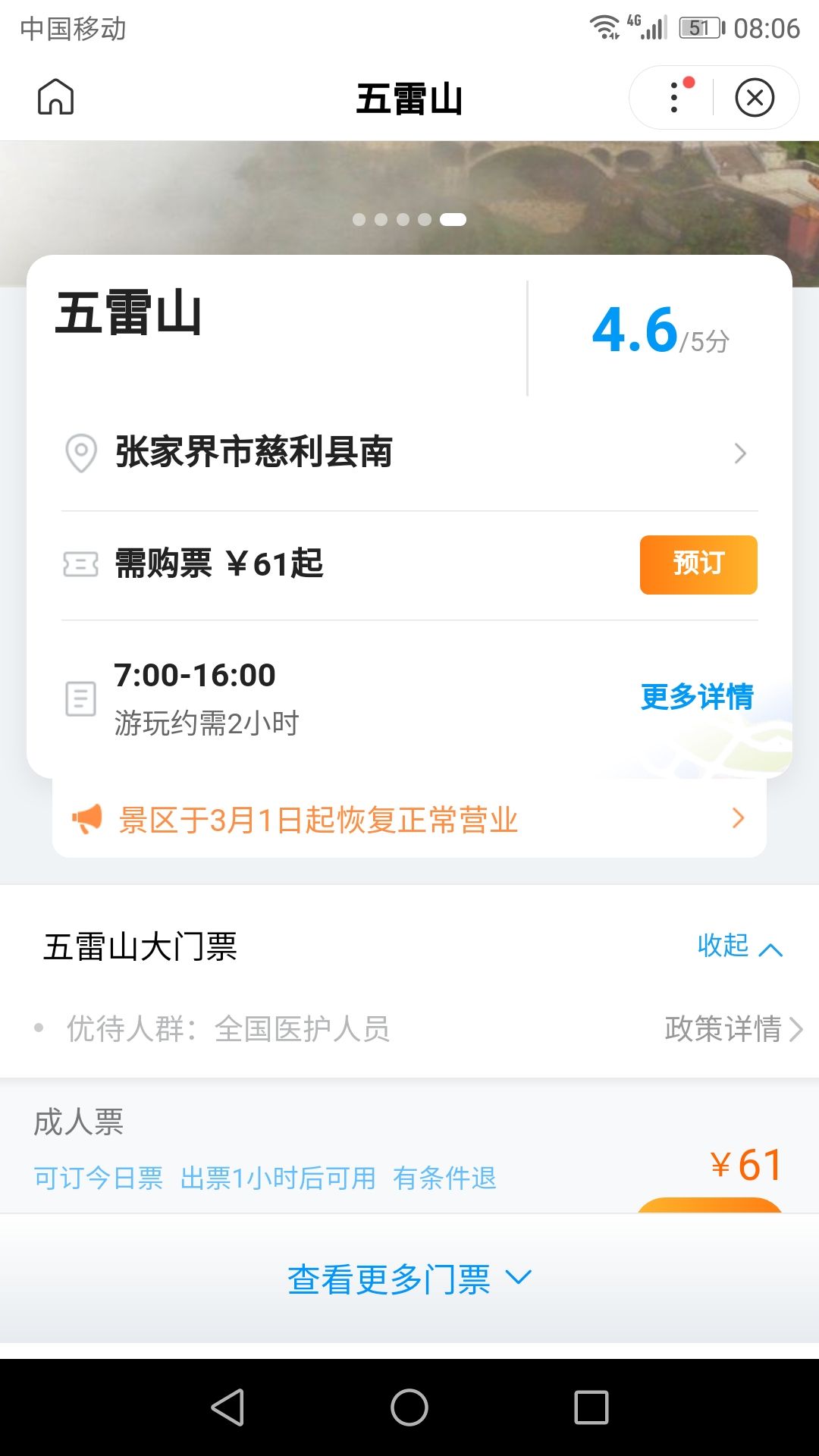 在携程上就可以买慈利县五雷山门票(成人票),标准价是68元,携程价是61元。