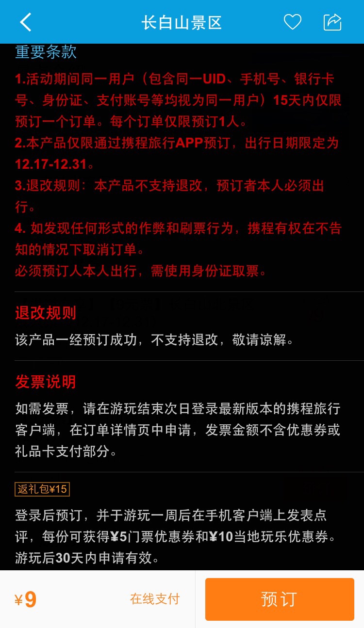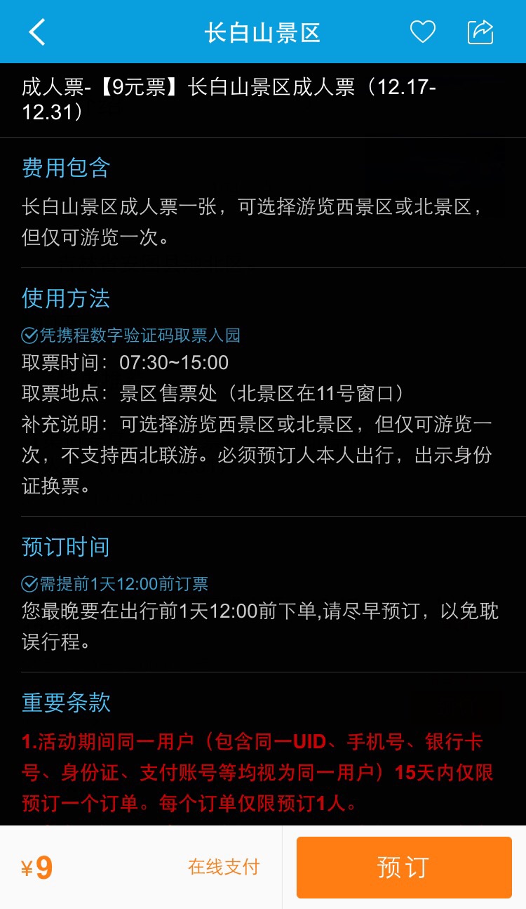 为感谢长期以来关注、热爱长白山的海内外朋友,长白山开发建设集团与携程旅游网近日签署长期战略合作协议,于12月16日正式启动“长白山景区9元特惠门票”活动,真诚回馈“冲白而来绝不白来”的游客们。