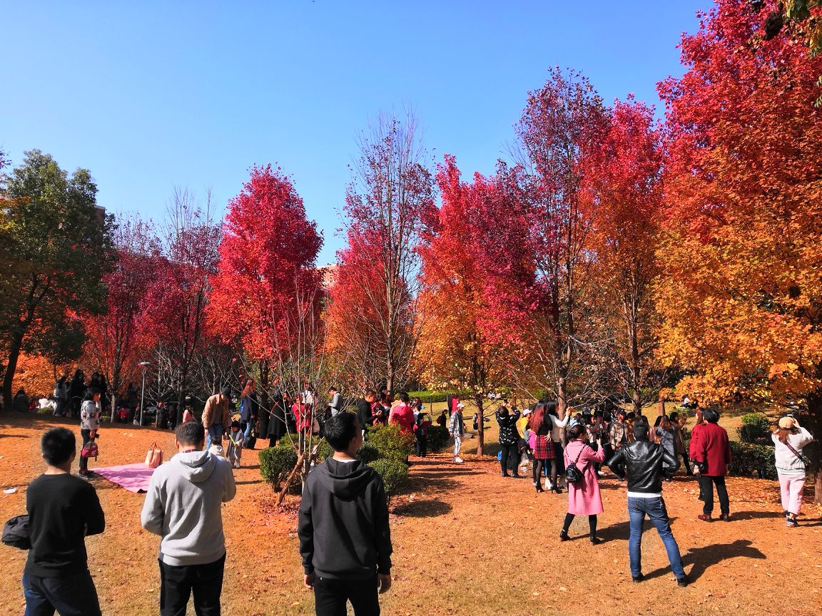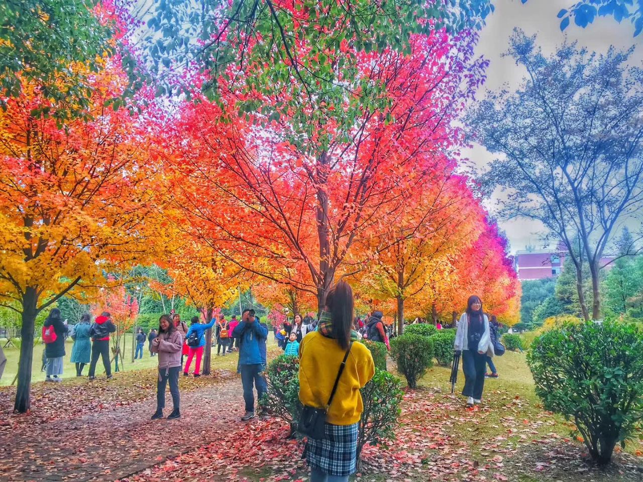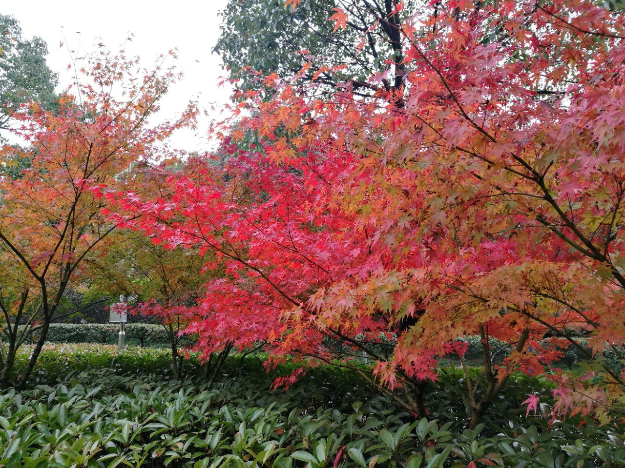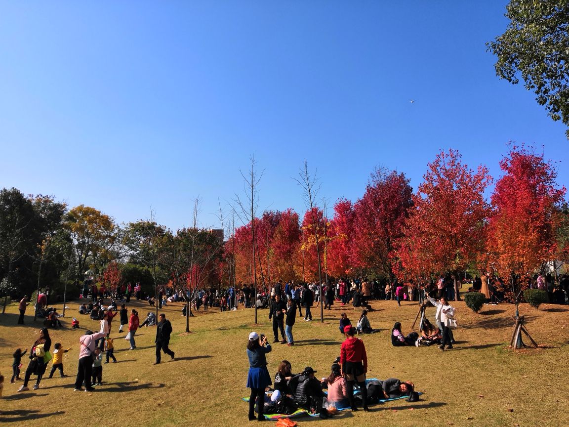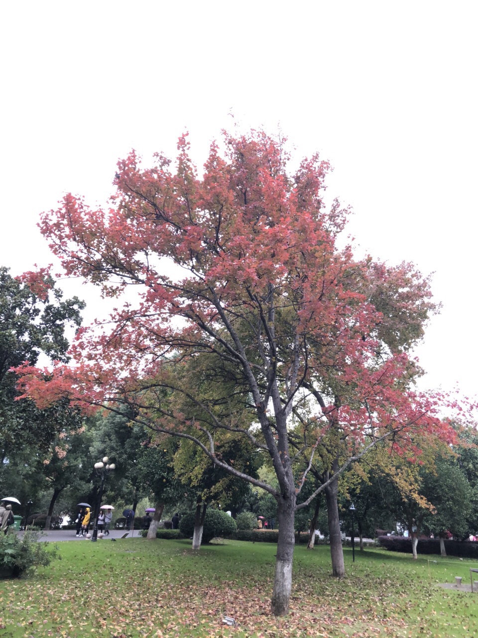 烈士公园有近百株枫香,目前枫叶红了30[%] 左右, 公园里的枫树主要成片地分布在烈士塔周边及南门入口水塘四周,园内其它各处也有零星分布。