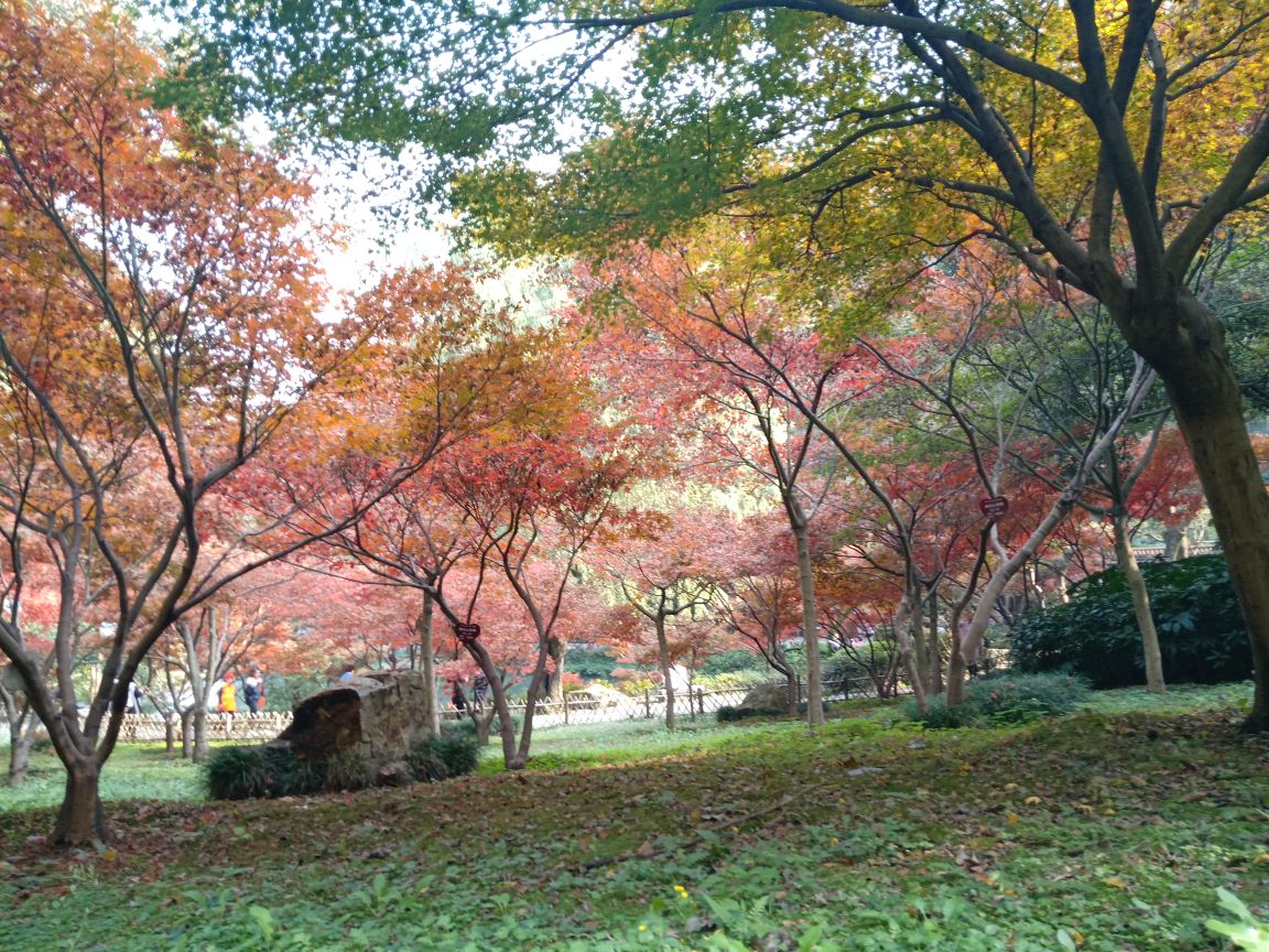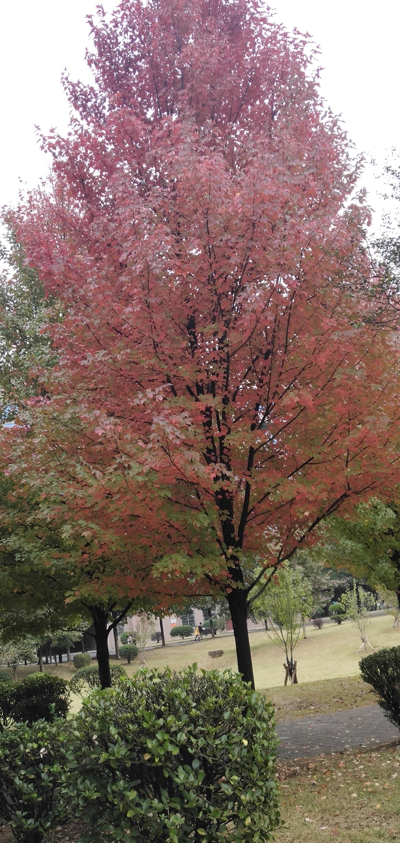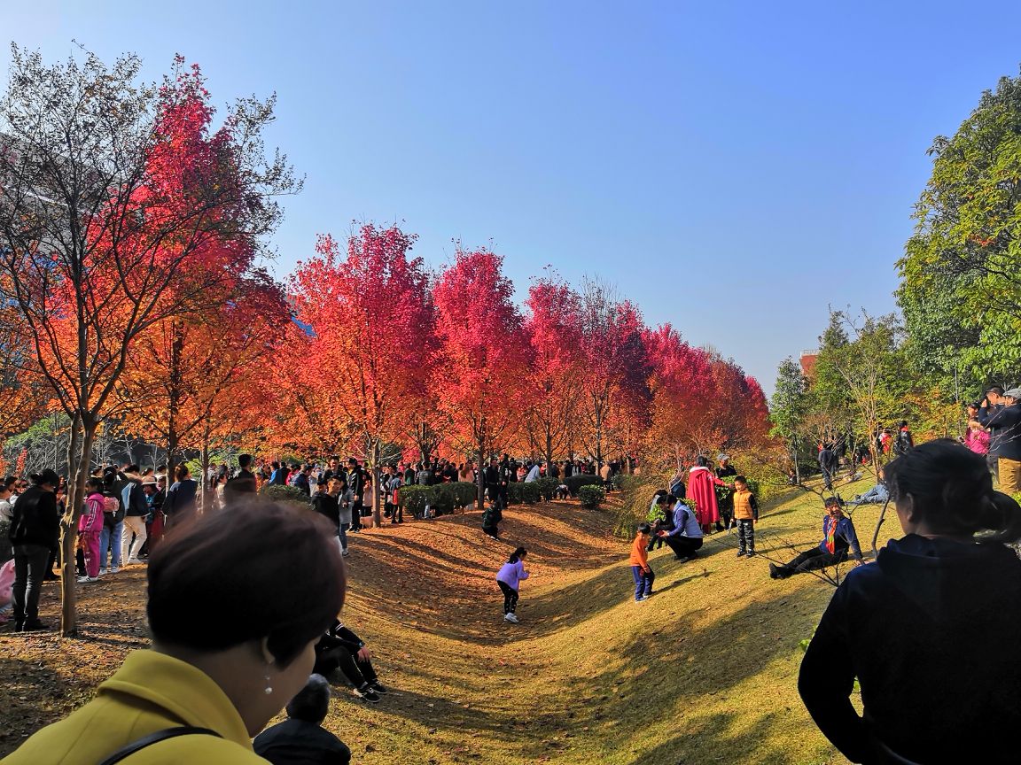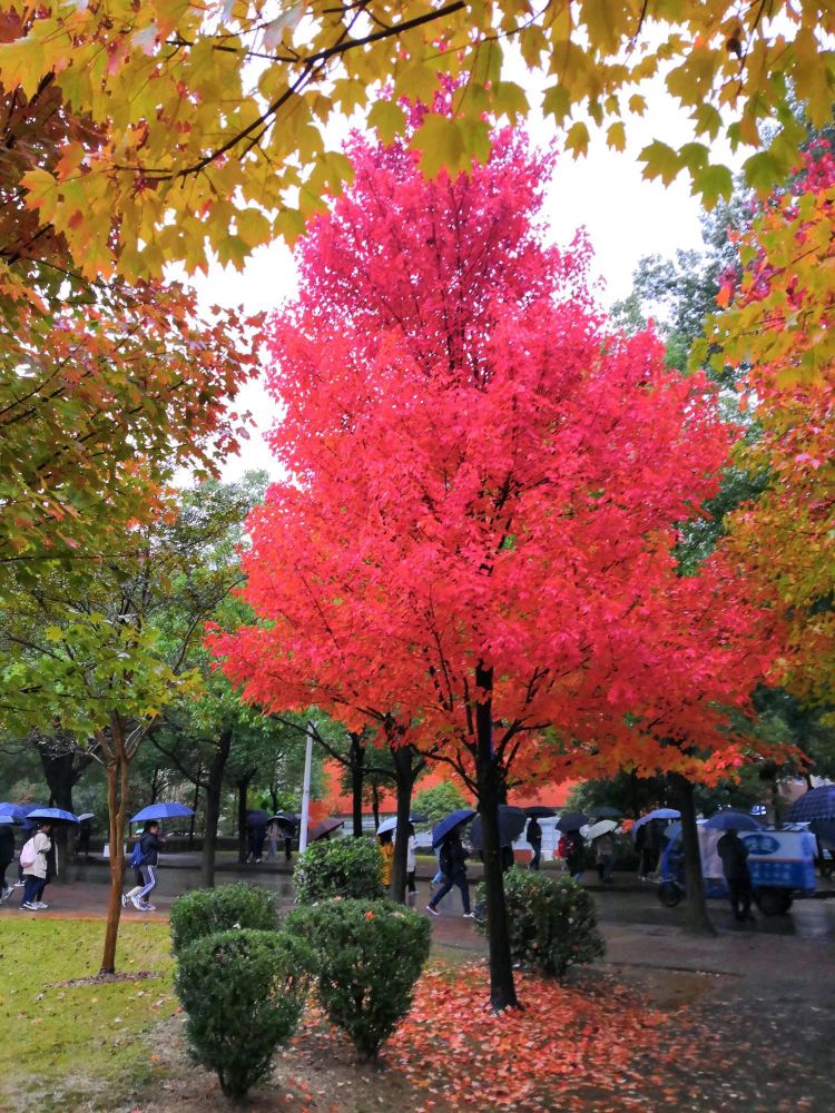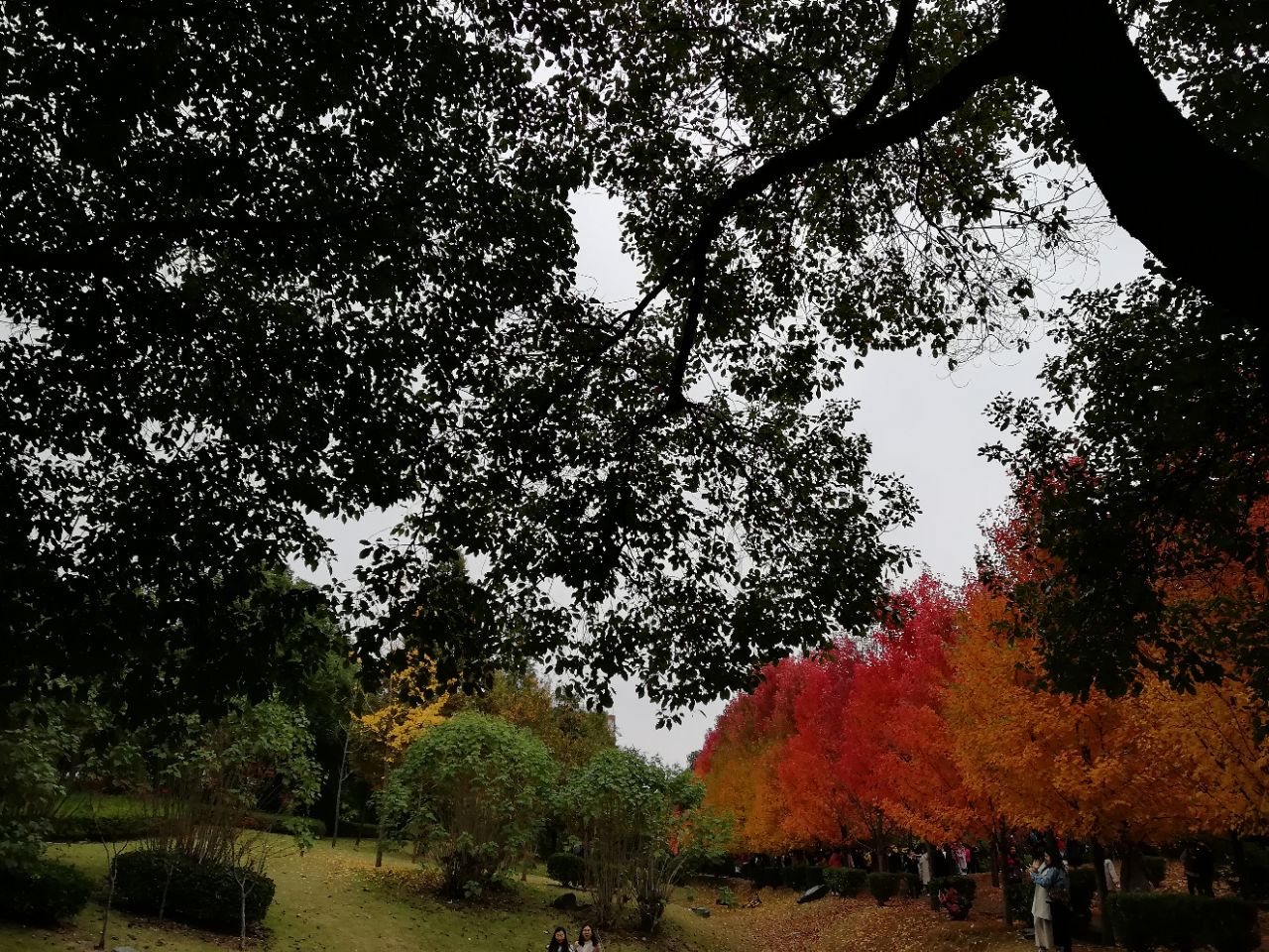 烈士公园有近百株枫香,目前枫叶红了30[%] 左右, 公园里的枫树主要成片地分布在烈士塔周边及南门入口水塘四周,园内其它各处也有零星分布。