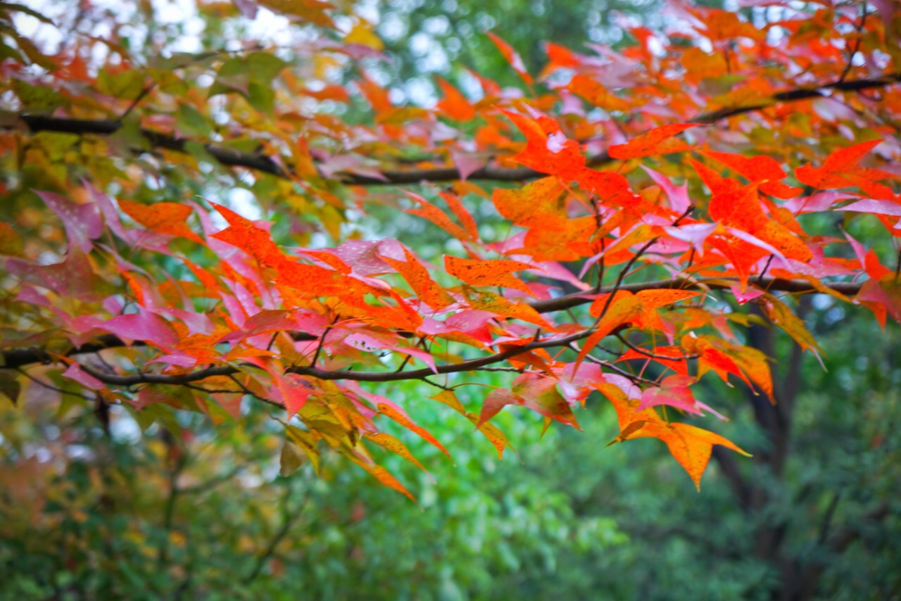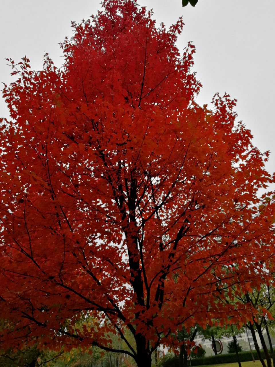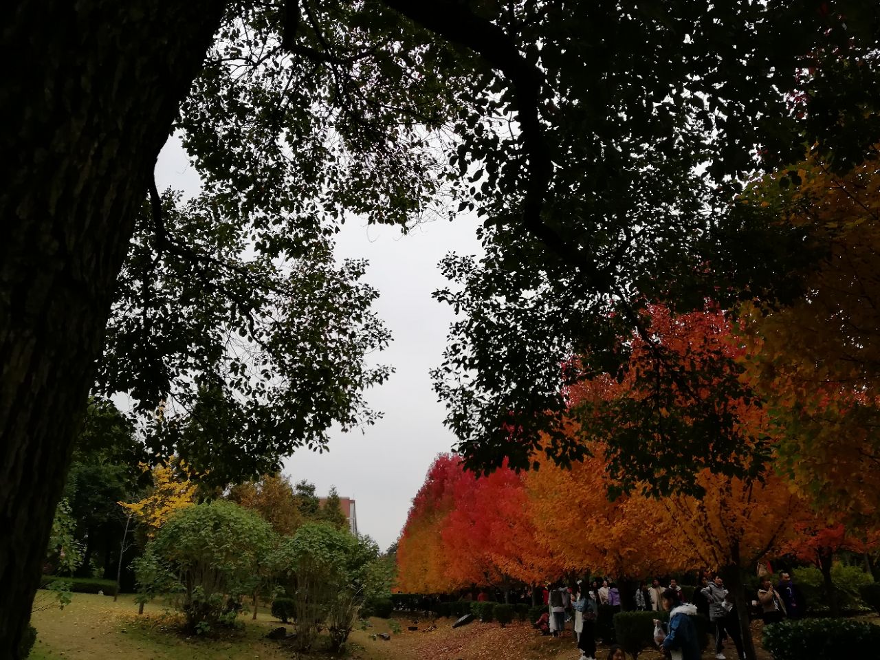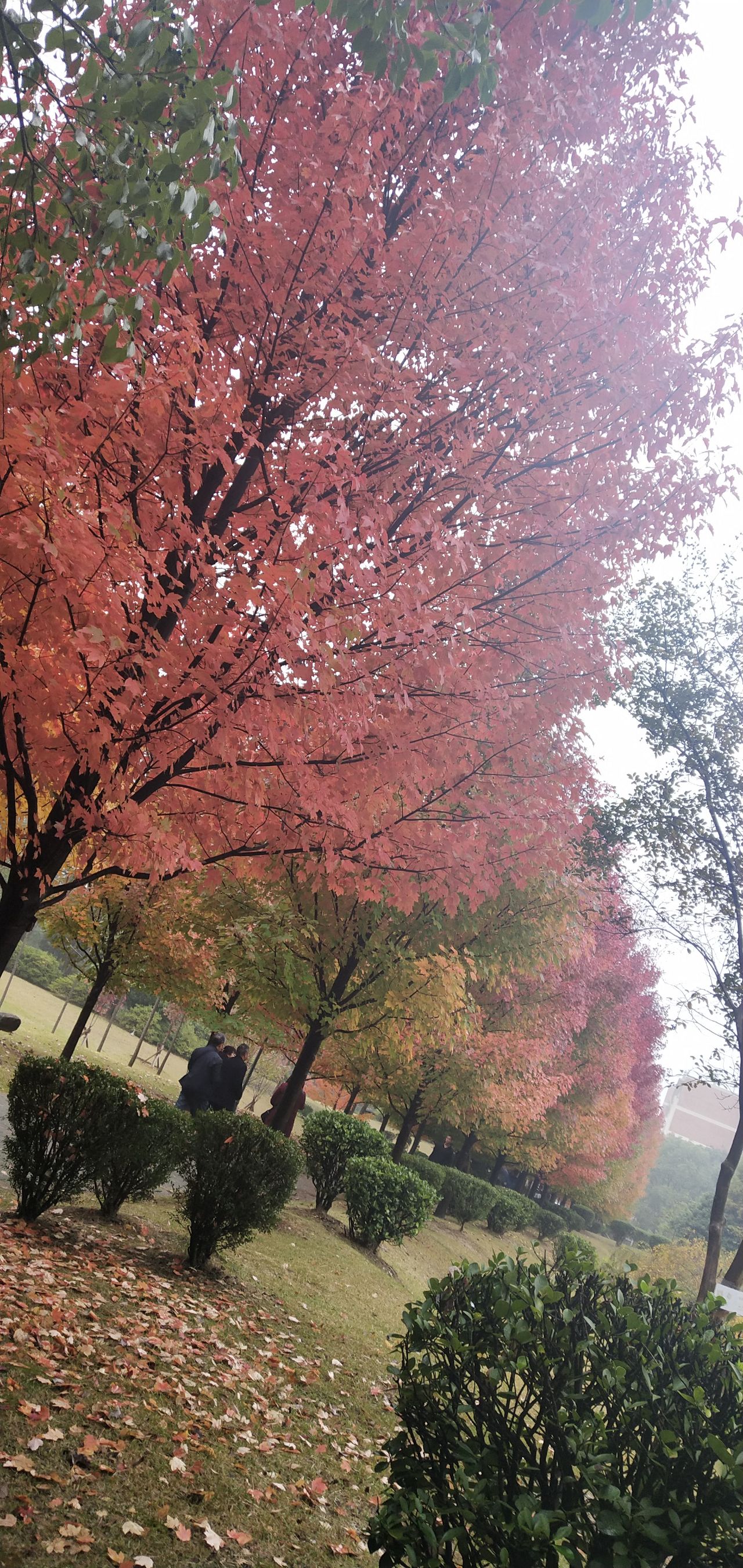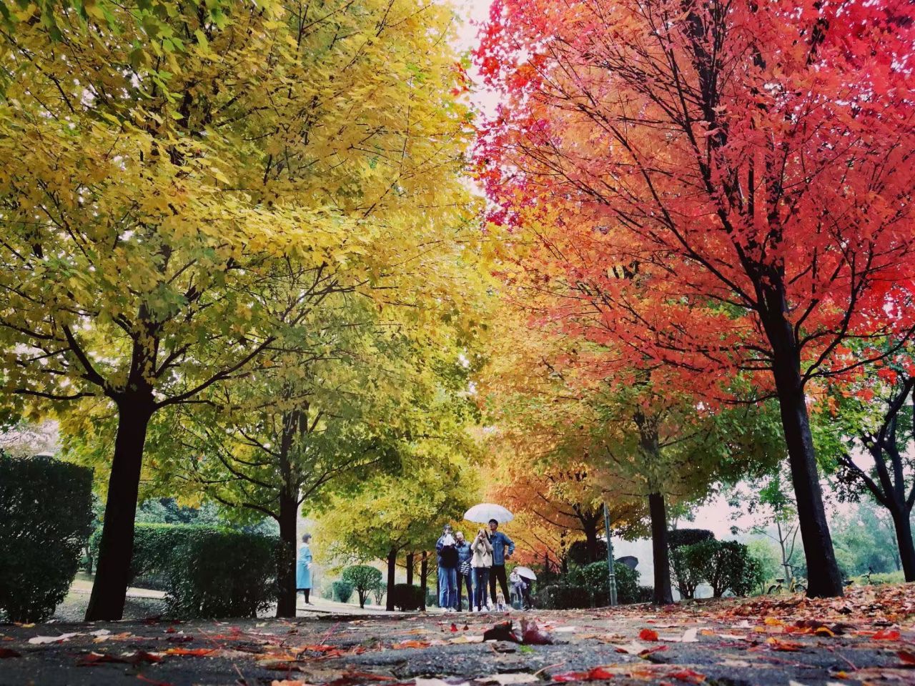 烈士公园有近百株枫香,目前枫叶红了30[%] 左右, 公园里的枫树主要成片地分布在烈士塔周边及南门入口水塘四周,园内其它各处也有零星分布。