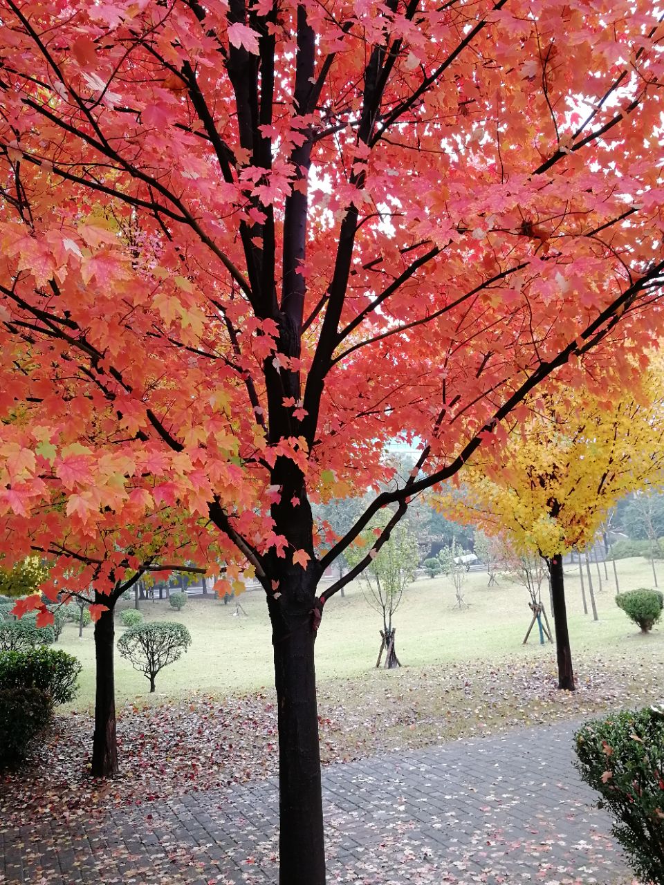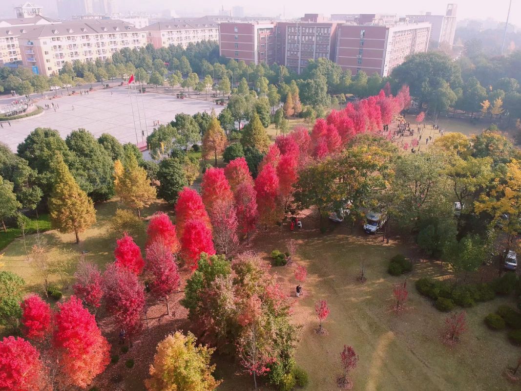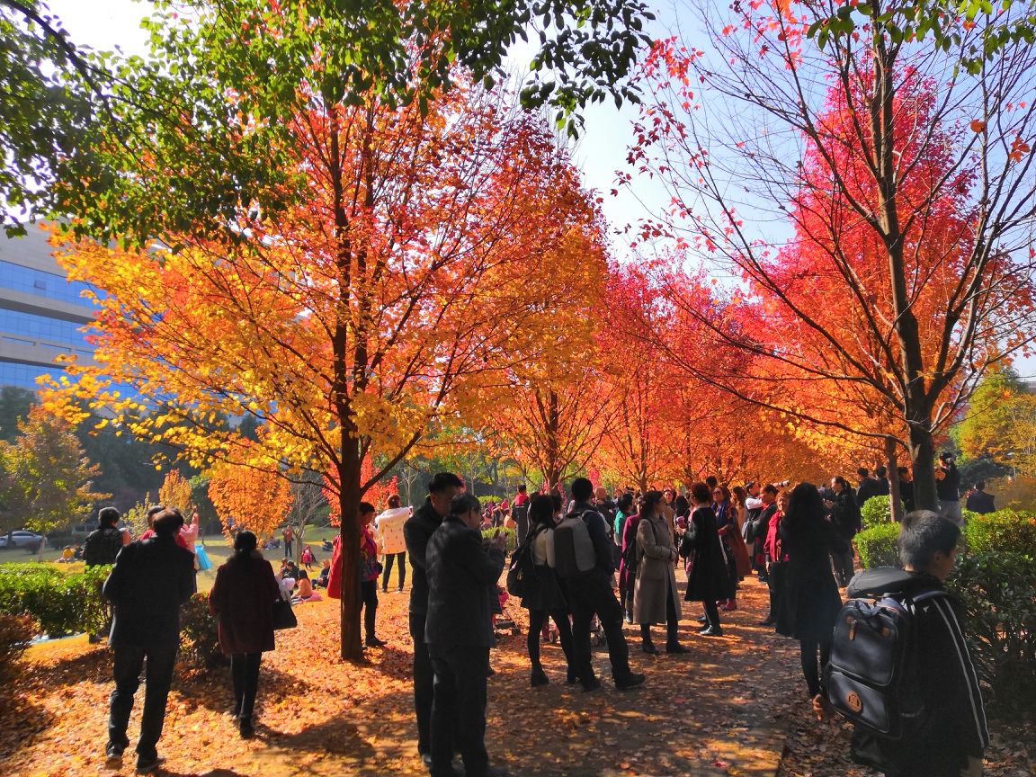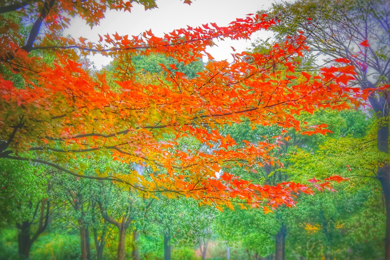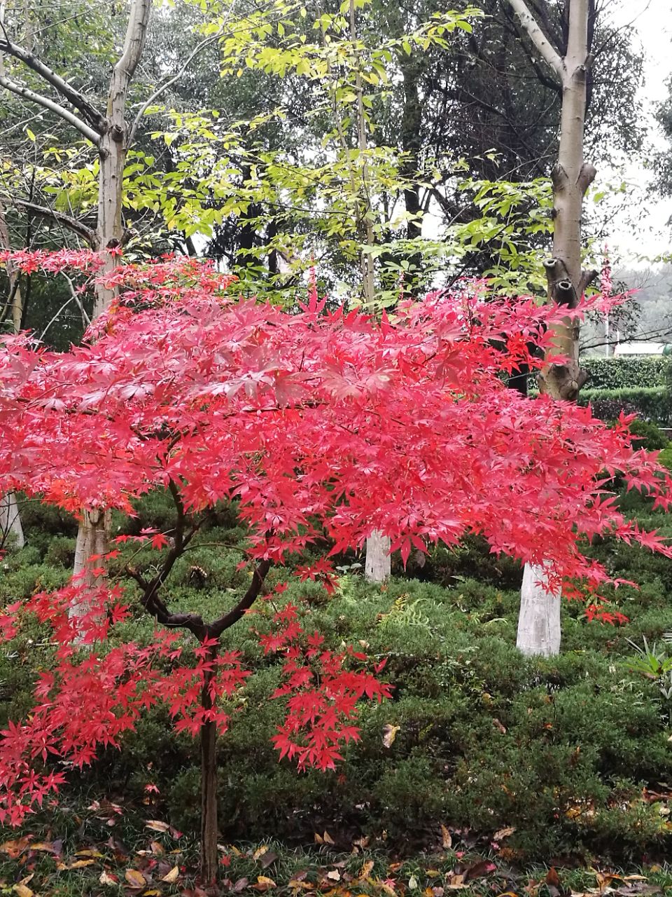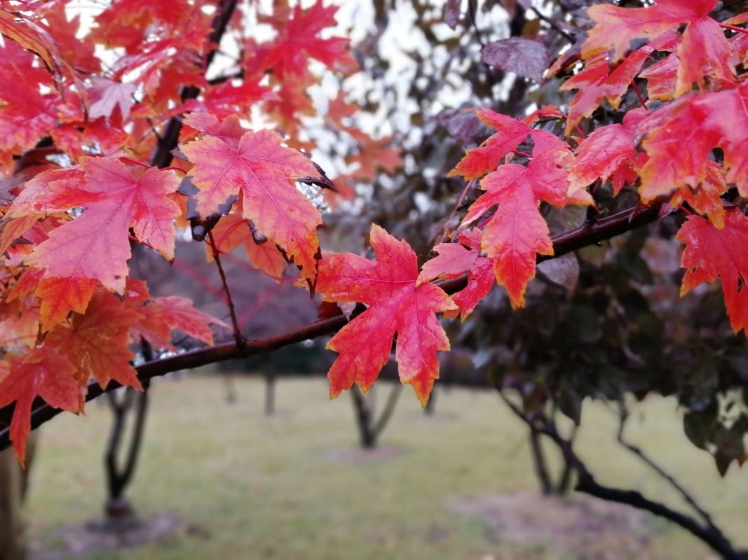 烈士公园有近百株枫香,目前枫叶红了30[%] 左右, 公园里的枫树主要成片地分布在烈士塔周边及南门入口水塘四周,园内其它各处也有零星分布。