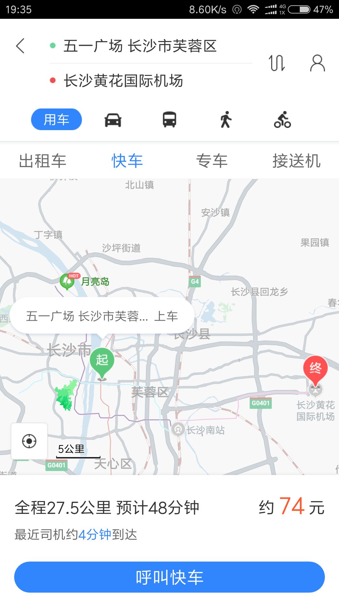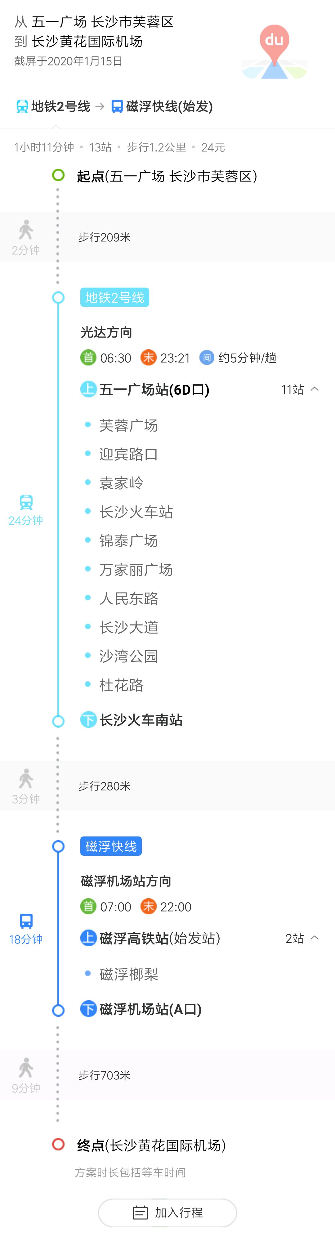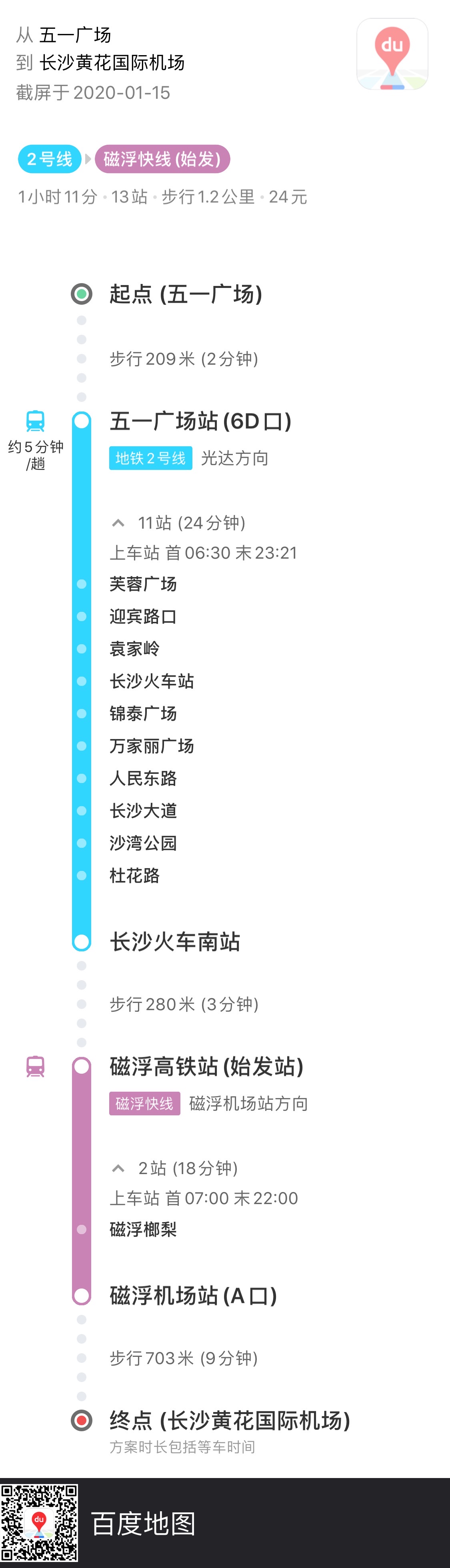 坐车的时间大约一小时,算上地铁进出站及坐车的时间比一小时多一些。从五一广场坐地铁2号线到长沙南站然后转地铁磁悬浮线到机场。