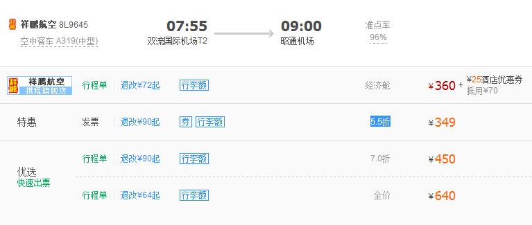 2.在携程机票预订界面,输入成都和昭通两个地址即可查询机票价格,每日每时段价格不等.