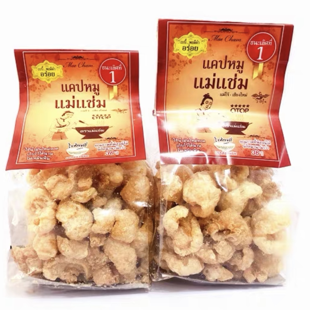 2. 炸猪皮,约50泰铢/包,看大小和容量还有品牌,价格不同。也不知道为什么炸猪皮会是清迈特产,也没有看到清迈猪有特别多啊。不过味道还蛮好的,类似是松松的猪油渣的味道,阿姨妈妈们非常喜爱。