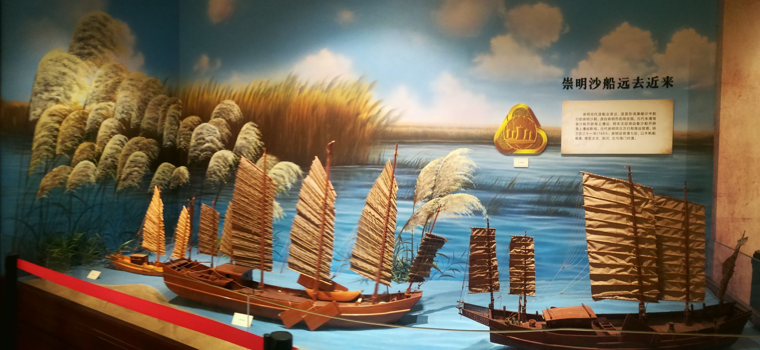 崇明博物馆现有“崇明岛史与古船”、“崇明民俗”两个陈列区域,展品丰富。大成殿是学宫的主体建筑,原是祭祀孔子的主要场所,而大成殿东西两边的古建筑东庑和西庑,原是专列孔子的弟子及历代儒家学者的牌位之处,现在都成为展出示“崇明岛史与古船陈列”的展厅,可以看到多种模型、沙盘、文物以及文字说明,展示了崇明岛各方面的建设发展与成就。这里展出的两艘唐、宋古船,是上海地区独一无二的珍贵文物,堪称镇馆之宝。